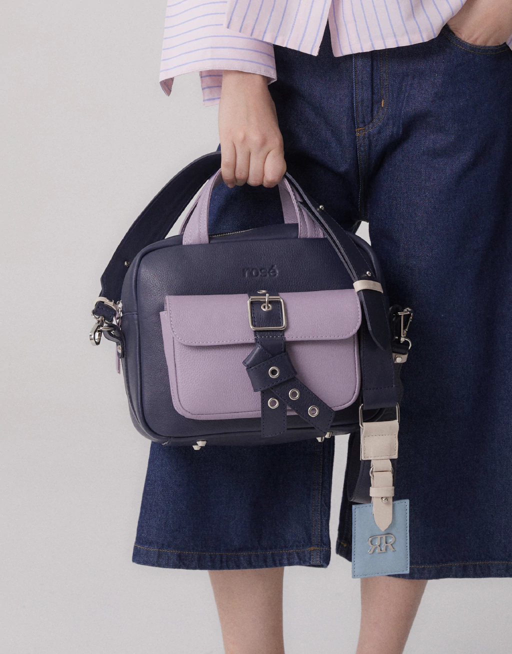 Contiene una manija corta de mano acolchonada. La correa de hombro es regulable y desmontable. Te permite elegir el calce que te resulte más cómodo. Además, contiene un llavero con aplique metálico personalizado, desmontable, sujeto a la correa larga.