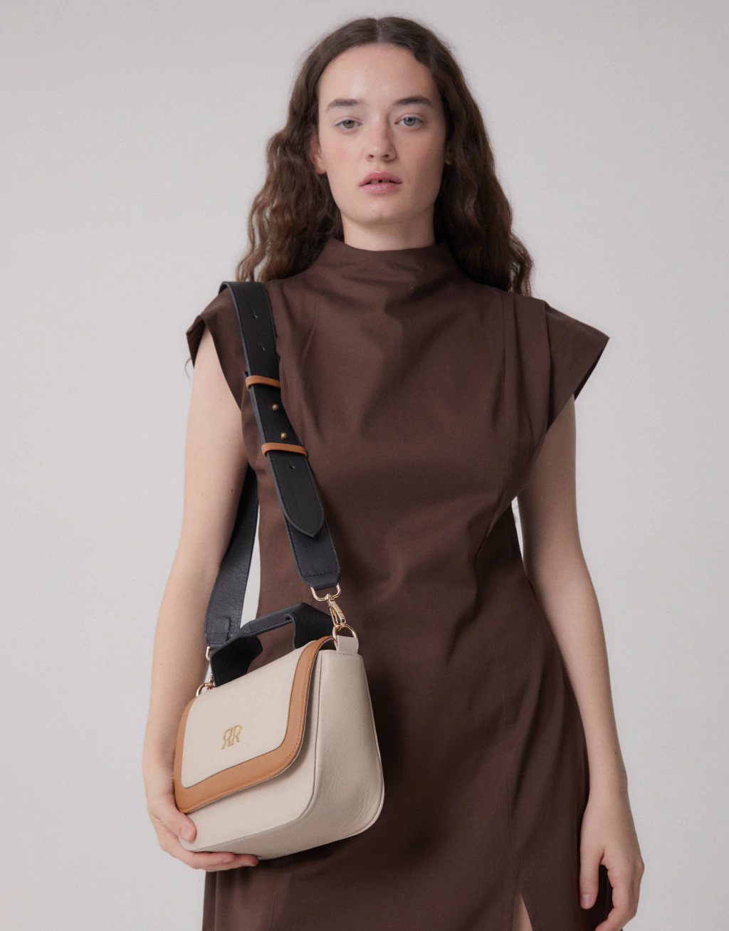 Cartera Miranda es un diseño exclusivo de Rosé Concept. Su acceso es mediante una solapa con broche imán. Posee una correa corta de mano, y otra larga regulable mediante gemelos.