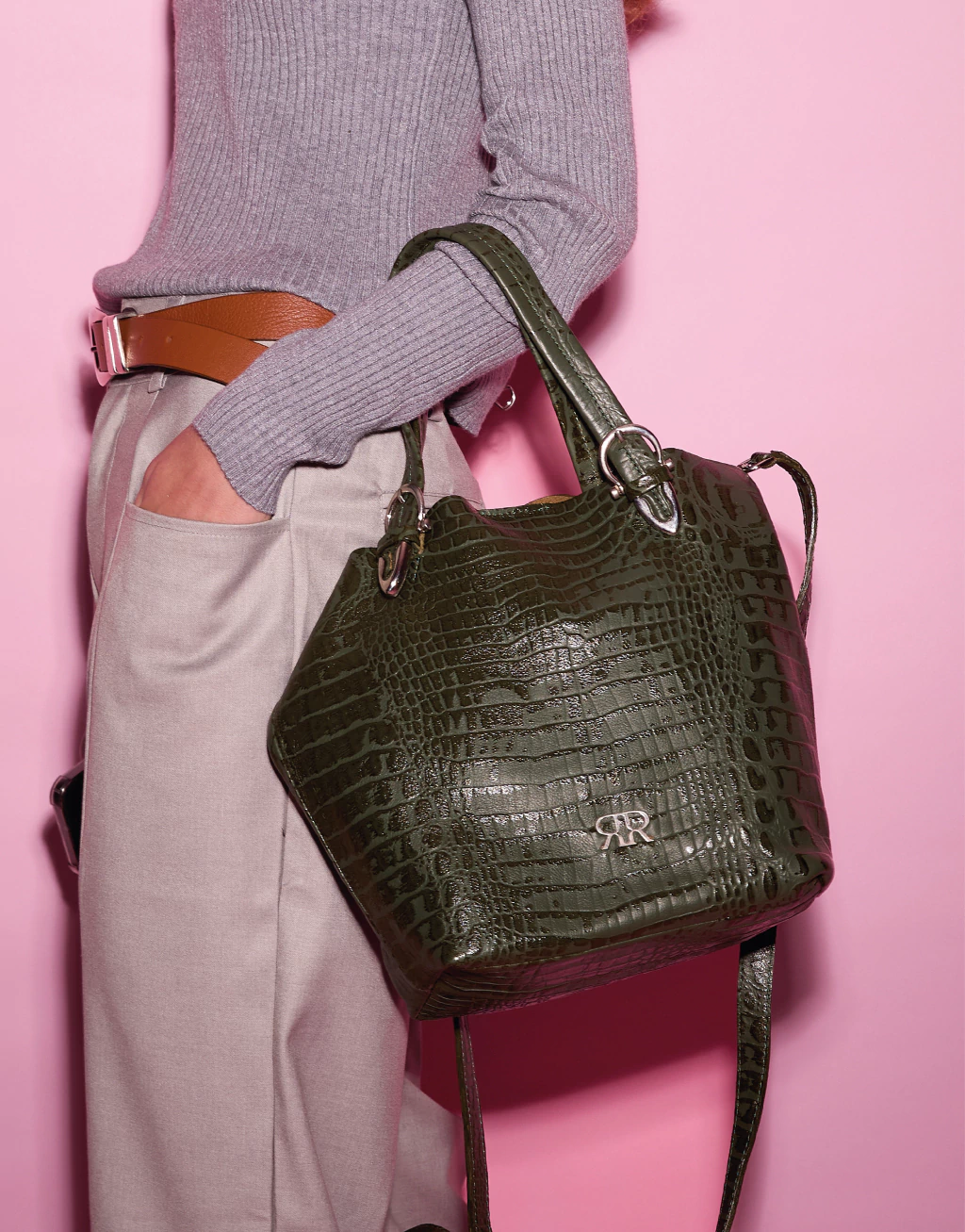Tiene doble correa: para usarla al hombro y correa regulable para usarla cruzada. Sobre el frente tiene hebillas y punteras a modo de vista. Tambien, nuestro aplique metálico exclusivo de marca.