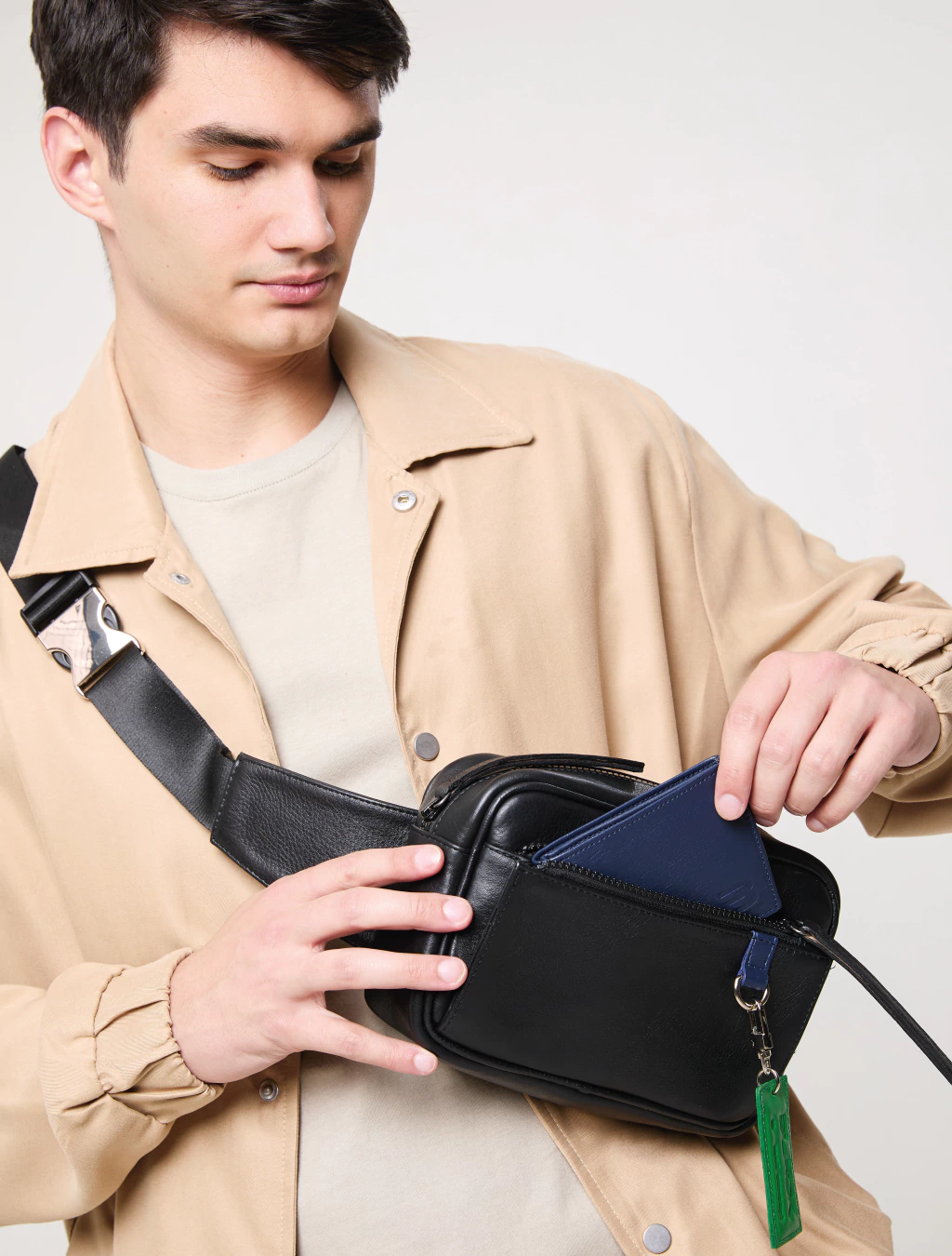 Bolso tipo riñonera de formato rectangular, confeccionado en cuero vacuno graneado con detalles en cuero liso. Un diseño minimalista pero funcional, ideal para llevar cruzado al hombro o en la cintura, según tu estilo y el momento.