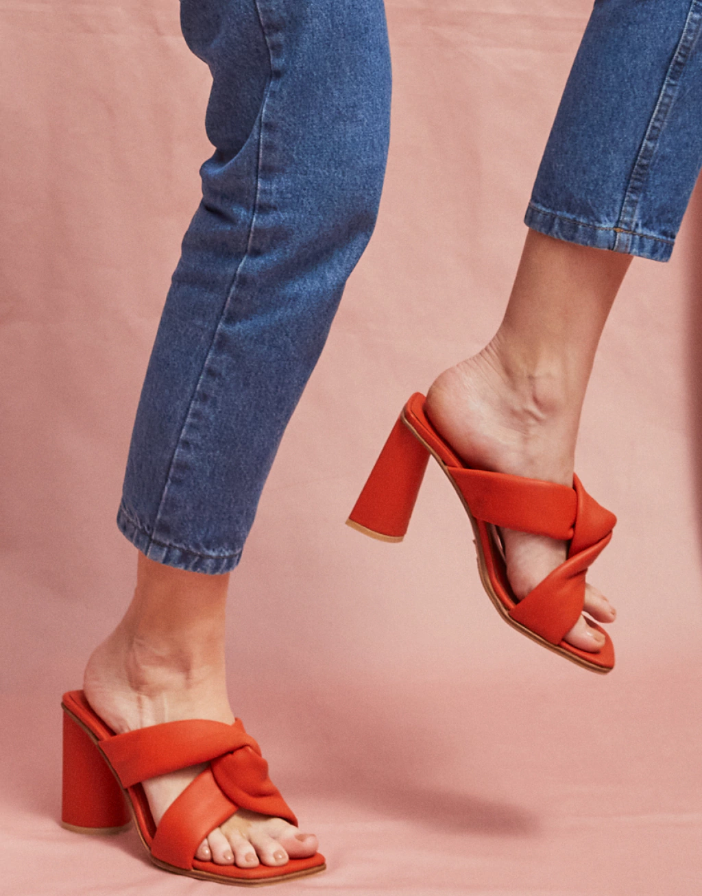 Sandalia alta de punta cuadrada con nudo en capellada. Perfecta para looks de día y de noche! Altura de taco: 9,7 cm.