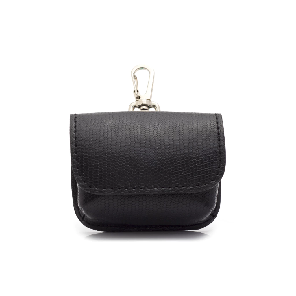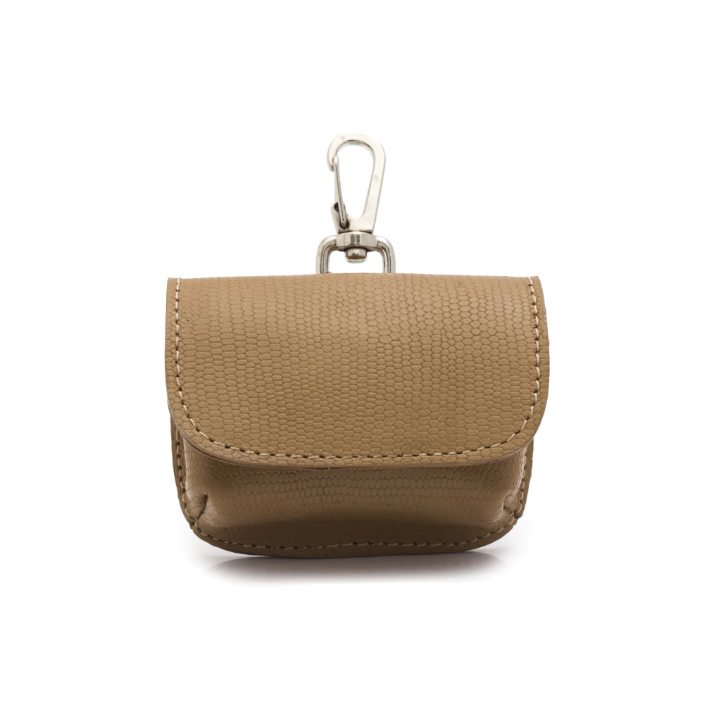 Porta Airpods/Auriculares confeccionado en cuero, desplegable con solapa y broche a presión. El interior se encuentra forrado con tejido de algodón estampado de Rosé Concept.